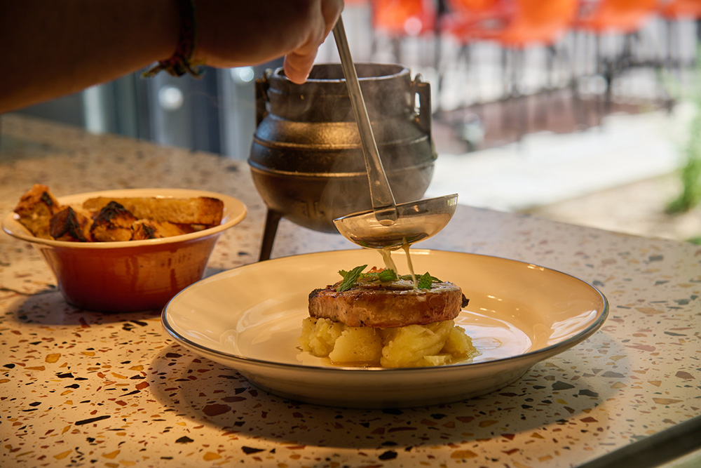 The fire-based cuisine, featuring an impressive seven-meter chimney, allows guests to watch the chef prepare meals, immersing them in a special culinary experience within a warm, friendly atmosphere. The heat and aromas awaken the senses at this restaurant in Viana do Alentejo!
