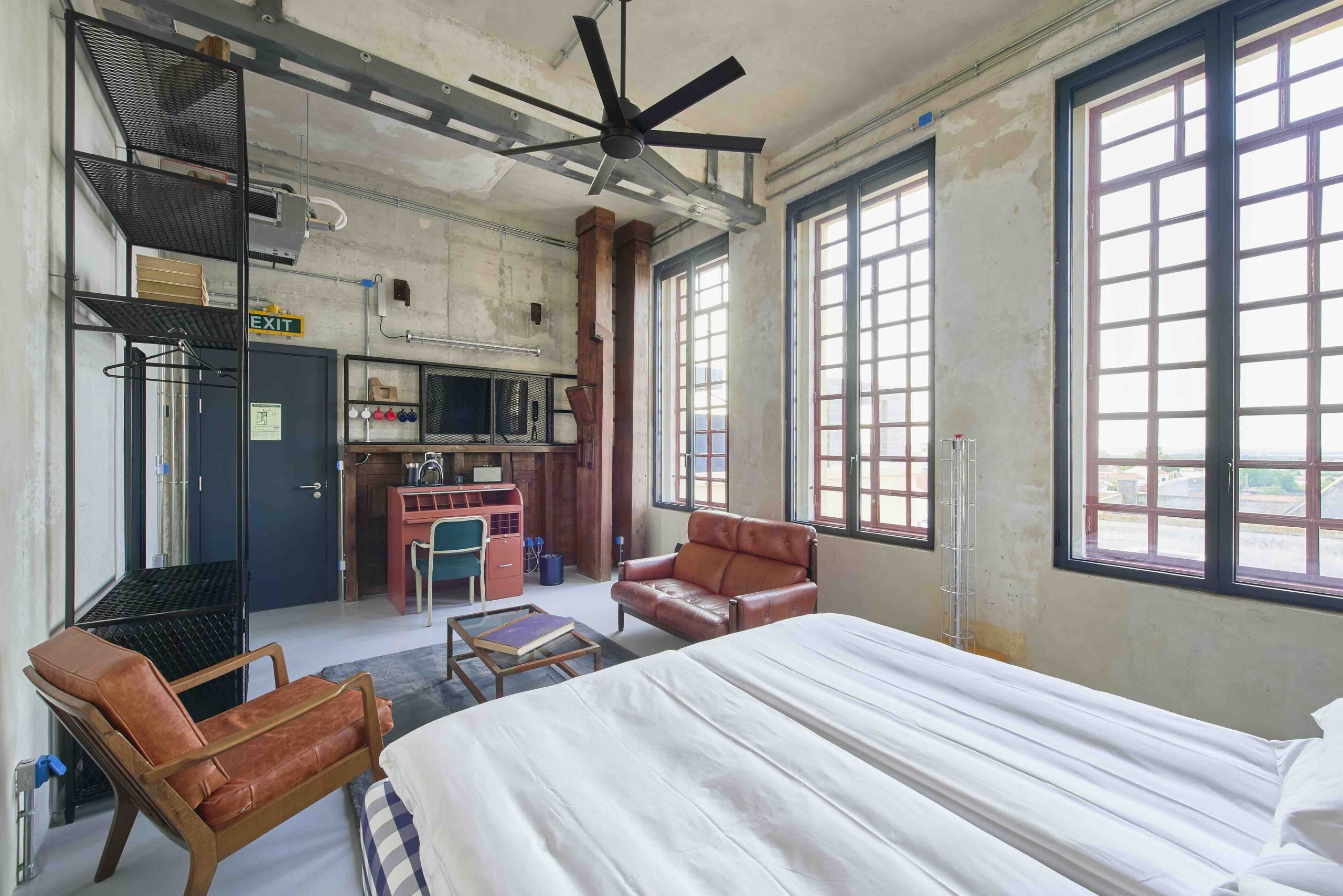 The contrast between industrial heritage and contemporary comfort.